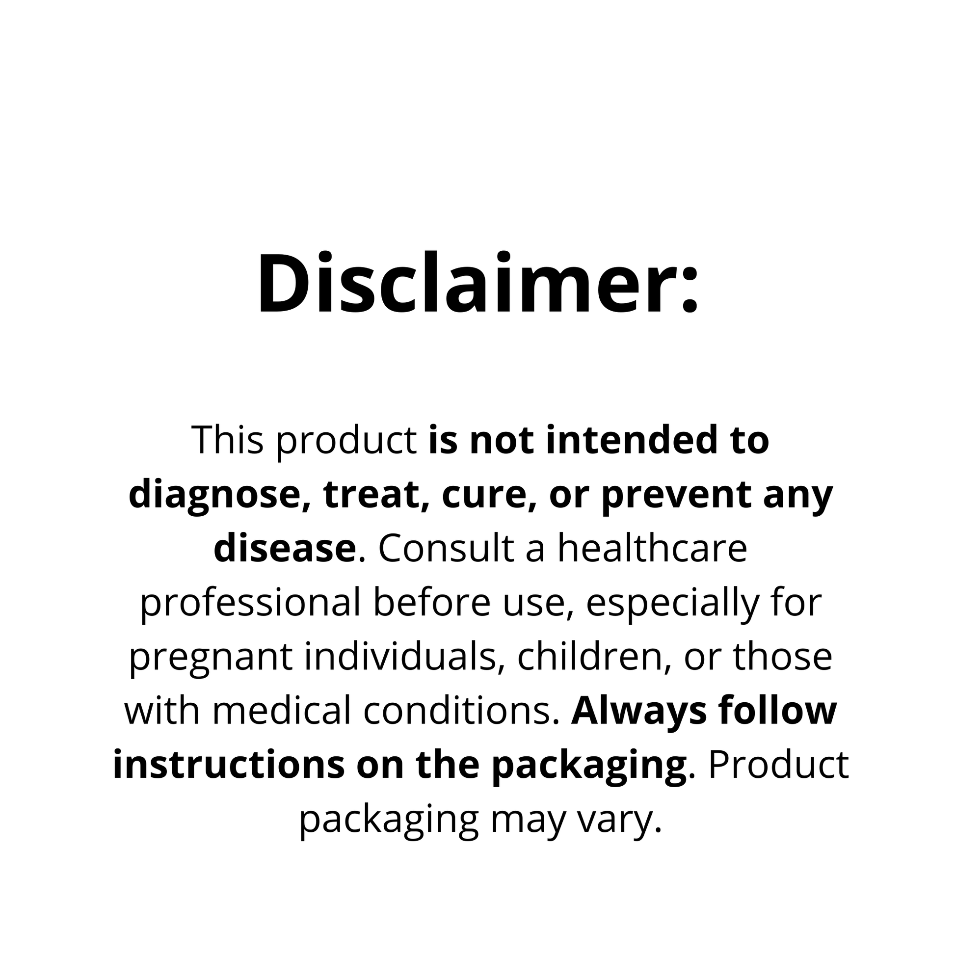 This product is not intended to diagnose, treat, cure, or prevent any disease. Consult a healthcare professional before use, especially for pregnant individuals, children, or those with medical conditions. Always follow instructions on the packaging. Product packaging may vary.